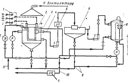 Рис. 6. Схема установки электрохимического умягчения воды I - выпрямитель ВАКГ-3200-18; 2 - диафрагменный электролизер; 3, 4 - аналит и каталит; 5 - насос; 6 - рН-метр; 7 - осветлитель со слоем взвешенного осадка; 8 - осветлительный скорый фильтр; 9 - сброс в канализацию; 10, 11 - отвод умягченной и подача исходной воды; 12 - расходомер; 13 - вытяжной зонт