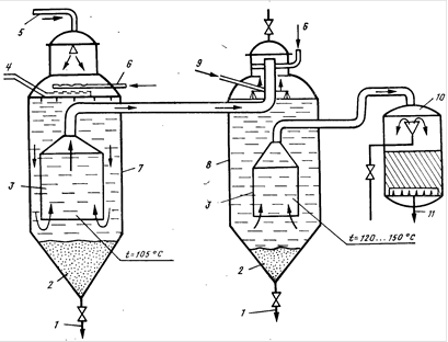 Рис. 8. Установка известково-содового умягчения воды с фосфатным доумягчением: 1 - сброс шлама из накопителя 2,3 - сборник умягченной воды; 4 - ввод извести и соды; 5, 11 - подача исходной и отвод умягченной воды; 6 - ввод пара; 7, 8 - термореактор первой и второй ступени; 9 - ввод тринатрийфосфата; 10 - осветлительный скорый фильтр
