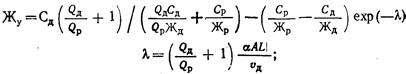 где Сд и Ср - концентрации солей в начале аппарата соответственно в диализате и в рассоле, мг-экв/л; и Qp - производительность аппарата соответственно по диализату и рассолу, м3 /ч; Жд и Жр - жесткость диализата и рассола в начале аппарата, мг-экв/л; а - константа, определяемая свойствами мембран и растворов;; L - длина пути раствора в диализатной и рассольной камерах аппарата, м; υд - скорость движения диализата в камере, м/с.