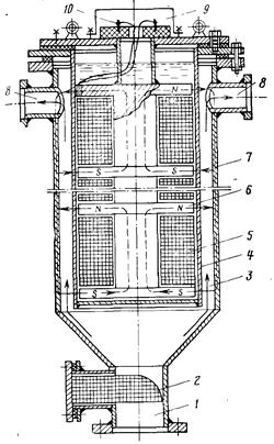 Рис. 9. Электромагнитный аппарат для противонакипной обработки воды СКВ ВТИ: 1,8 - подача исходной и отвод омагниченной воды; 2 - сетка; 3 - рабочий зазор для прохода омагничиваемой воды; 4 - кожух; 5 - намагничивающая катушка; 6 - сердечник; 7 - корпус; 9 - крышка; 10 – клеммы