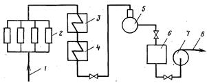 1,8 - исходная и подпиточная вода; 2 - электромагнитные аппараты; 3, 4 - подогреватели I и II ступени; 5 - деаэратор; 6 - промежуточный бак; 7 - подпиточный насос