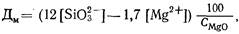 где [Si032-] и [Mg2+] — соответственно концентрации ионов кремниевой кислоты и магния в исходной воде, мг/л; Дк — доза коагулянта (FeClили FeS04), мг/л; ек — эквивалентная масса активного вещества коагулянта, мг/мг-экв; Ссао— содержание СаО в каустическом магнезите или обожженном доломите, %; CMgo— содержание MgOв каустическом магнезите иди обожженном доломите, ,%; Жк — карбонатная жесткость исходной воды, мг-экв/л; [СО2] — содержание оксида углерода (IV) в обрабатываемой воде, мг/л.