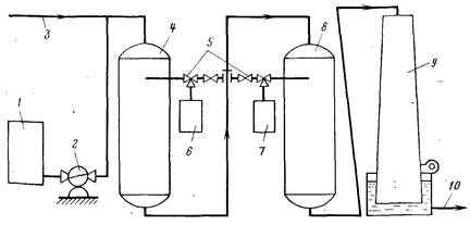 1 — бак с раствором фторида натрия; 2 — насос-дозатор; 3, 10 — подача исходной и отвод обессоленной и декремнизированной воды; 4 — водород-катионитовый фильтр; 5 — эжектор; 6, 7 — бак с раствором щелочи исерной кислоты; 8 — ОН-анионитовый фильтр; 9 — дегазатор