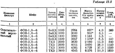 Нашей промышленностью серийно выпускаются (табл. 12.5) напорные вертикальные фильтры пяти типоразмеров. Высота Фильтрующей загрузки в фильтрах всех размеров принята 1>2 м. Наибольший диаметр напорного фильтра из условий удобства перевозки железнодорожным транспортом принят 3,4 м, фильтрующая площадь такого фильтра составляет 7,1м2 Поэтому при более или менее значительной производительности водоочистной установки приходится устраивать большое число фильтров и арматуры, что удорожает строительство и усложняет эксплуатацию фильтров. Число устанавливаемых напорных фильтров может быть сокращено примерно в 4 раза в случае применения горизонтальных напорных фильтров, площадь фильтрования которых составляет 28... 30 м2, или вертикальных двух — и трехкамерных фильтров.