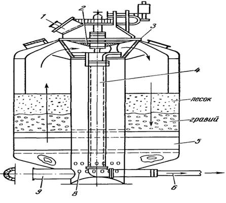 При медленном фильтровании взвеси в основном (до 90..95%) задерживаются на пленке и в самом верхнем слое фильтра толщиной около 2... 3 см. В глубь песка вследствие небольшой скорости фильтрования и малого размера пор взвесь переносится в небольшом количестве, поэтому накопление их в толще фильтрующего слоя идет очень медленно. В связи с этим при очистке медленных фильтров очищают только верхний слой песка. Часто этот слой просто удаляют, после чего фильтр снова может фильтровать воду. Вследствие малой скорости фильтрования накопление загрязнений в медленном фильтре протекает замедленно. При небольшой мутности воды чистка фильтра необходима через 1 ... 2 месяца.