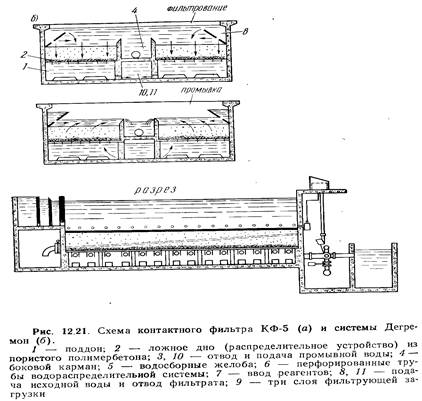 В системах муниципального, а также производственного водоснабжения нашел применение прямоточный открытый контактный фильтр КФ-5 (рис. 12.21, а) с трехслойной фильтрующей загрузкой (по 0,5 каждый). Верхний слой (керамзит, аглопорит, полимеры) имеет крупность зерен 2,3 ... 3,3 мм; средний (антрацит, керамзит, горелые породы) — 1,25... 2,3 мм; нижний (кварцевый или гранитный песок, горелые породы) — 0,8... 1,25 мм. Скорость фильтрования до 20 м/ч, интенсивность промывки 15 л/(с-м2), продолжительность — 6 ... 8 мин.