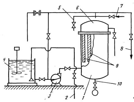 1 — распределительный объем фильтра; 2, 8 — подача и отвод воды; 9 — фильтрующие керамические патроны; 4 — бак приготовления фильтрующей суспензии; 6 — камера обработанной воды; 7 — подача промывной воды; 10 — сброс осадка; 3 — насос; 5 — сброс воздуха