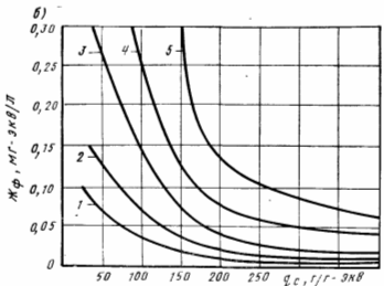 Рис. 20.11. Кинетика работы катионитового фильтра (а) и графики для определения удельного расхода поваренной соли на регенерацию в зависимости от требуемой жесткости фильтрата Жф и жесткости исходной воды (б), мг-экв/л.