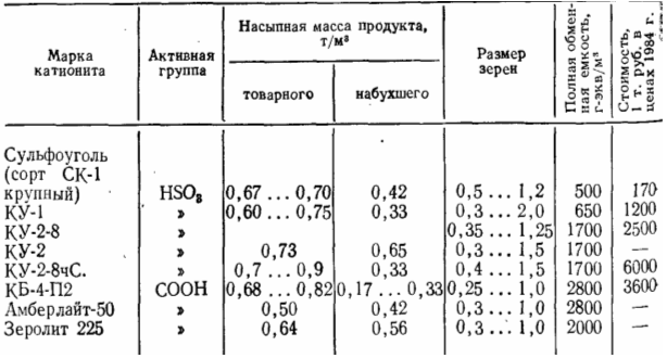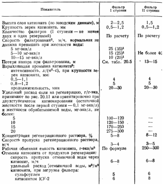 Рабочая обменная емкость катионита зависит от вида извлекаемых из воды катионов, соотношения солей в умягчаемой воде, значения рН, высоты слоя катионита, скорости фильтрования, режима эксплуатации катионитовых фильтров, удельного расхода регенерирующего реагента и от других факторов. В табл. 20.3 приведены технологические характеристики катионитов.