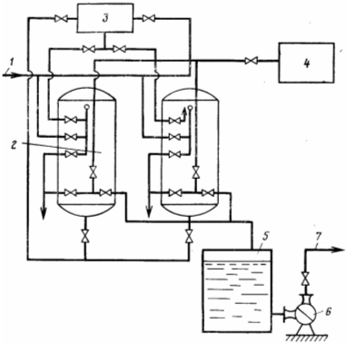 1,7 — подача исходной и отвод умягченной воды; 2 — натрий- катионитовый фильтр; 3 — бак с раствором поваренной соли; 4 — бак с частично умягченной водой для взрыхления катионита; 5 — резервуар умягченной воды; 6 — насос