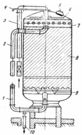 1,2 — ввод исходной и отвод умягченной воды; 3, 10 — подача регенерационного раствора и сброс отмывочной воды; 4 — воздушник; 5 — люк; 6 — реагентораспределитель; 7, 9 — дренажная и распределительная колпачковая система; 8 — слой катионита