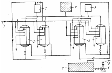1,9— подача исходной и отвод умягченной воды; 2, 6 — натрий-катионитовые фильтры I и II ступени; 3, 5 — баки с раствором соли для регенерации фильтров I и II ступени; 4 — бак с водой для взрыхления загрузки фильтров; 7 — резервуар умягченной воды; 8 — насос