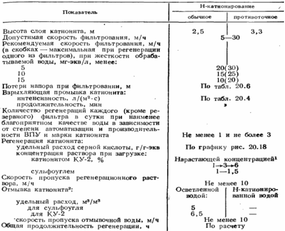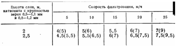 Примечания: 1. В скобках даны скорости фильтрования при загрузке мелким катионитом с крупностью зерен 0,3—0,8 мм.