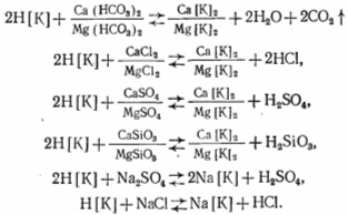 Обработка воды водород-катионированием (Н-катионированием) основана на фильтровании ее через слой катионита, содержащего в качестве обменных ионов катионы водорода. Процесс описывается следующими реакциями: