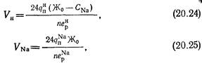 где [Na+], [Са2+], [Mg2+] — концентрации в воде соответственно ионов натрия, кальция и магния, мг-экв/л; [НС03~], [С1~], [S042-] — концентрации в воде соответственно бикарбонатов, хлоридов и сульфатов, мг-экв/л; Жо — общая жесткость исходной воды, мг-экв/л; то условия применения Н-катионирования с «голодной» регенерацией фильтров определяются данными, приведенными в табл. 20.7, а их расчет согласно данных табл. 20.8.