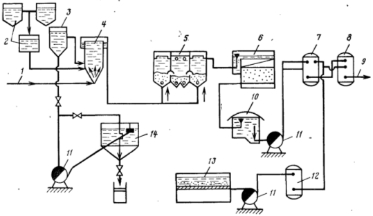 1,9 — подача исходной и отвод умягченной воды; 2 — аппаратура для коагулирования воды; 3 — дозатор известкового молока; 4 — смеситель (реактор); 5 — осветлитель со слоем взвешенного осадка; 6 — скорый осветлительный фильтр; 7,8 — натрий-катионитовый фильтр I и II ступени; 15 — промежуточный резервуар; 11 — повысительный насос; 12 — фильтр для осветления солевого раствора; 13 — бак мокрого хранения поваренной соли; 14 — бак известкового молока с гидравлическим перемешиванием