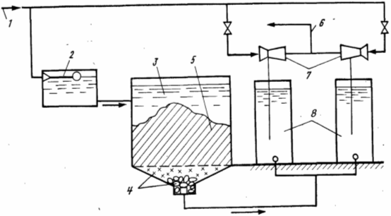 Рис. 20.19. Схема солевого хозяйства. 3 — резервуар-хранилище поваренной соли; 4 — гравийно-песчаный осветлительный фильтр; 5 — слой соли; 1 — подача воды; 2 — бак постоянного уровня; 6 — отвод раствора соли на регенерацию; 7 — эжектор; 8 — расходные баки соли