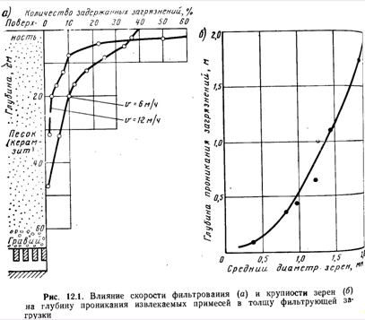 1) задержание примесей на поверхности фильтрующего слоя (пленочное фильтрование) описываемое формулой Хазена δ = 0,01 (v*d3 )0.5 , где δ — диаметр наименьших задерживаемых частиц, мм; d3 — эффективный диаметр зерен загрузки, мм; v— скорость фильтрования до 10 м/ч;