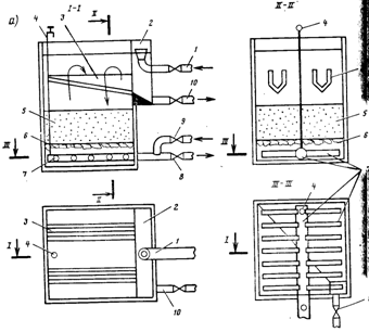 Рис. 12.2. Схема открытого (безнапорного) скорого фильтра с боковым карманом (а) и боковым отводом промывной воды (б).