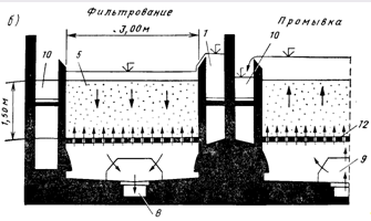 7 — распределительная система: магистральная труба (или канал) и перфорированные ответвления; 6 — поддерживающий слой гравия (щебня); 5 — фильтрующая загрузка (кварцевый песок, керамзит, шунгизит и др.); 3 — водосборные желоба; 4 — воздушник; 2 — боковой карман; 1, 8 — подача исходной воды и отвод фильтрата; 9, 10 — подача и отвод промывной воды; 11 — водосток; 12 — колпачковая распределительная (дренажная) система.