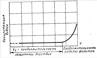 По мере накопления осадка в загрузке явление отрыва ранее прилипших частиц начинает проявляться все более заметно. Характер кривых изменяется (рис. 12.3, кривые 2, 3, 4). Они показывают, что роль слоев загрузки, расположенных вблизи от поверхности, в осветвлении воды уменьшается. После продолжительной работы фильтра насыщение этих слоев осадком становится предельным и они перестают осветлять воду. На графике (рис. 12.3, кривая 4) отмечена толщина участка загрузки *нас, которая находится в состоянии предельного насыщения к этому времени работы аппарата. По мере насыщения верхних слоев загрузки возрастает роль ниже расположенных, а толщина загрузки, необходимая для извлечения из воды взвеси, увеличивается. Затем наступает такой момент, когда вся толщина загрузки недостаточна для обеспечения необходимой степени осветления воды и концентрация взвеси на выходе из загрузки начинает возрастать (рис. 12.3, кривая 4). Время, в течение которого загрузка способна осветлять воду до требуемой степени, называется временем защитного действия загрузки. До Достижения этого времени на выходе из загрузки получают воду надлежащего качества. По истечении времени защитного Действия качество фильтрата начинает быстро ухудшаться (рис. 12.4).
