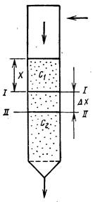 Одной из основных задач изучения закономерностей процесса осветления воды фильтрованием является нахождение времени защитного действия загрузки. Выделим в моделе фильтра элементарный слой загрузки толщиной Δх на расстоянии х от ее поверхности (рис. 12.5). К верхнему сечению слоя площадью равной единице, подходит вода с массовой концентрацией частиц С1 а через нижнее сечение она выходит из слоя с концентрацией С2 . Уменьшение концентрации частиц в элементарном слое составляет