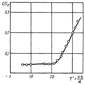 Для процессов, протекающих подобно, масштабные множители обычно определяют методами теории размерностей. Обобщенная кривая С/С0 = f1 (Х') при Т' = const, которая дает одновременно представление о влиянии на ход процесса толщины фильтрующего слоя, скорости фильтрования и размера зерен загрузки. Она показывает, что качество фильтрата зависит от перечисленных факторов лишь на определенном участке значений X. При достаточно больших значениях X изменение этих факторов практически не оказывает влияния на качество фильтрата. Поэтому для получения устойчивого эффекта осветления воды фильтровальные аппараты Должны работать в области достаточно больших значений X. При этом условии увеличение скорости фильтрования в определенных пределах не вызовет ухудшения качества фильтрата. Обобщенная кривая С/С0 =/2 (Т') при X'= const. Как видно из совмещенного графика, необходимый эффект осветления сохраняется на определенном интервале значений Т. Используя теорию размерностей, значения критериев X и Т находим из выражений X' — x/(v7d1'7)