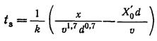 Значение критериального комплекса X' удобно определять с помощью номограммы (рис. 12.11). Расчет скорости фильтрования и параметров загрузки проводится по методу постепенного приближения. Например, если требуется определить скорость фильтрования и толщину слоя загрузки при заданном ее зерновом составе, то необходимо сначала, задавшись некоторым произвольным значением, скорости, вычислить по формуле (12.45) толщину слоя загрузки х. Затем по формуле (12.47) определить продолжительность защитного действия — U, найдя входящий в формулу параметр X' по номограмме. Если найденное Uне соответствует заданному оптимального режима значению, то задаются другим значением скорости фильтрования и вычисления повторяют до тех пор, пока не будет получена требуемая продолжительность защитного действия загрузки.