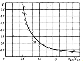 Задача определения расчетной скорости фильтрования и параметров загрузки фильтров при оптимальном режиме их работы сводится к совместному решению уравнений (12.18) и (12.44), в которых заданными величинами являются параметры фильтрования a/b, bи А (определяются по результатам технологического анализа воды): продолжительность рабочего цикла (в соответствии с требованиями СНиП 2.04.02—84 расчетная продолжительность фильтроцикла принимается 12 ч); продолжительность защитного действия загрузки t3 назначается в соответствии с принятым для оптимального режима отношением t3 /tu .Предельная потеря напора Нпр назначается в соответствии с высотной схемой водоочистного комплекса. Неизвестными величинами в уравнениях (12.18) и (12.44) остаются скорость фильтрования v,толщина слоя загрузки х, эквивалентный диаметр зерен йэ и степень неоднородности загрузки ср. Последние две величины взаимосвязаны, так как зависят от зернового состава фильтрующей загрузки. Эквивалентный диаметр d3 вычисляют. Параметр ф находят по экспериментальному графику (рис. 12.10) по величине отношения d20 /d3 .Таким образом, имеем три неизвестных при двух уравнениях: скорость фильтрования, толщину слоя фильтрующей загрузки и ее зерновой состав. Поэтому задача расчета фильтров на оптимальный режим их работы имеет несколько решений. Следовательно, для получения одного определенного решения необходимо задаться или скоростью фильтрования, или толщиной слоя загрузки, или ее зерновым составом. Задавшись, например, зерновым составом фильтрующей загрузки, расчетом определяют ее необходимую толщину и скорость фильтрования. Для расчетов удобно преобразовать уравнение (12.44), решив его относительно толщины слоя х. Тогда оно примет вид