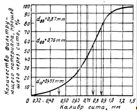 По данным табл. 12.1 построен график (рис. 12.12) ситового анализа фильтрующего материала, по которому можно определить основные показатели фильтрующей загрузки: эквивалентный диаметр зерен, который имеет важное значение при расчете фильтрующей загрузки; параметры, определяющие коэффициент неоднородности фильтрующей загрузки, а именно: 10%-ный калибр зерен материала, равный такому калибру сита, через который прошло 10% (по массе) просеиваемого материала, и 80%-ный калибр, равный такому калибру сита, через который прошло при просеивании 80% зерен (по массе).