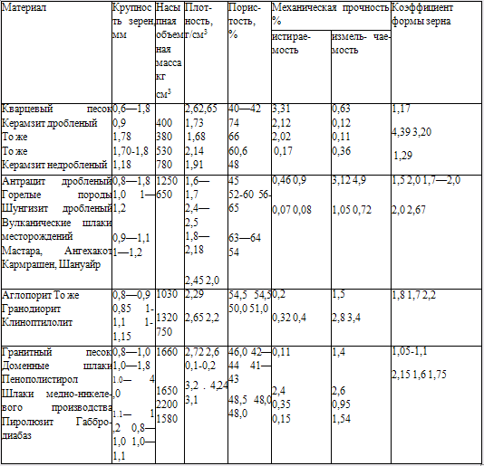 Наиболее распространенным фильтрующим материалом является кварцевый песок — речной или карьерный. Кварцевый песок при небольшом содержании примесей известняка отвечает всем вышеперечисленным требованиям, предъявляемым к фильтрующим материалам. Наряду с песком применяют антрацит, керамзит, горелые породы, шунгизит, вулканические и доменные шлаки, гранодиорит, пенополистирол и др. (табл. 12.2).