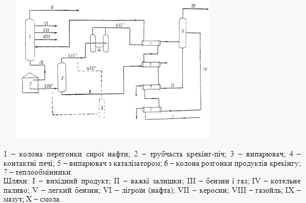Процес Термофор. Цей процес був розроблений фірмою Соконі вакуум ойл компани. Він складається з того, що каталізатор неперервно проходить через піч, протитоком до руху парів нафтопродуктів. Робоча температура рівна 400-530°С, тиск 0,7-1,8 атм, вагове відношення сировини до каталізатора приблизно 1:2-5. З нижньої частини печі каталізатор поступає у регенераційний пристрій, де відкладення вуглецю випалюються гарячим повітрям. Після цього каталізатор подають на верх печі. Процес перебігає неперервно.