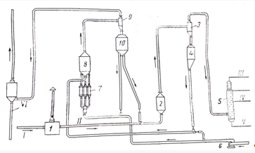 1 – піч-випарювач; 2 – реактор; 3, 9 – циклони; 4 – бункер для відпрацьованого каталізатора; 5 – ректифікаційна колона; 6 – повітродувка; 7 – теплообмінники; 8 – регенератор; 10 – ємкість регенерованого каталізатора.