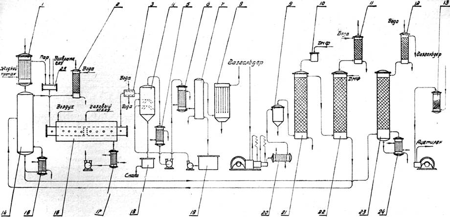 В абсорбере 21 происходит поглощение диацетилена диметилформ-амидом, при этом поглощается около 5% ацетилена, имеющегося в крекинг-газе. Диметилформамид, вытекающий из абсорбера, направляется на де- . сорбцию (на схеме не показано). Освобожденные от диацетилена крекинг-газы поступают в абсорбер ацетилена 22, в котором происходит поглощение диметилформамидом ацетилена, метилацетилена и некоторого количества других газов: этана, этилена, метана и пр. Газовый отход, содержащий углекислый газ, водород, азот, метан, этилен проходит очистку в водяном скруббере 11 и используется как топливо в печи 16.