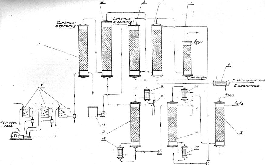 Диметилформамид с растворенным в нем диацетиленом, вытекающий из абсорбера 1, собирается в сборнике 13, из которого перекачивается десорбер3. Снизу в этот десорбер поступает газ, выходящий из абсорбеpa2. Этим газом из диметилформамида выдуваются растворенные в ацетилен и диацетилен, после чего он направляется на очистку. Часть газа, выходящего из абсорбера 2, поступает в десорбер4, орошаемый диметилформамидом, вытекающим из кубовой части десорбера16. В десорбере4 также отдувается растворенный в диметилформамиде ацетилен который вместе с газами, выходящими из десорбера3, поступает на отмывку водой в скруббер 5 и направляется далее на очистку (на схеме не указана).