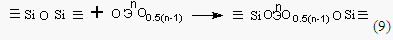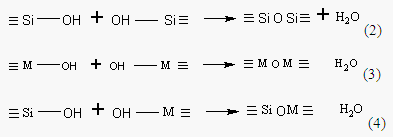 M[O(OH)2 SiR]x →{[RSi(O)1.5 MOx/2 }+xH2 O (8)