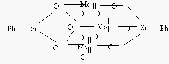Реакция замещения хлора при атоме кремния в фенилтрихлорсилане молибдат-ионами исследована авторами [21]. В результате выделена растворимая и нерастворимая фракции. Согласно данным элементного анализа состав растворимой фракции отвечает формуле Ph2 Si2 (MoO3 )4 . На основе данных элементного анализа, ИК-спектроскопии, гель-хроматографии, термического анализа и химического тестирования предложена трициклическая структура растворимой фракции молибден (VI) фенилсилоксана.
