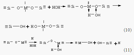Более высокая полярность связи O-M в группировках Si-O-M по сравнению с группой Si-O-Si в изоструктурных силоксанах обуславливает повышенную склонность гетеросилоксанов к гетеролитическим (ионным) реакциям, в частности, гидролизу. Когда электроотрицательность кремния и металла резко отличаются, гетеросилоксановая группировка Si-O-Mn гидролитически неустойчива. При действии воды она может либо обратимо диссоциировать на ионы Si-O- и M+ (при n=1 и M – щелочной металл), либо обратимо или необратимо гидролизоваться с первичным образованием фрагментов SiOHHOMn . По мнению авторов [44] механизм гидролиза связи M-O-Si заключается в образовании координационного переходного комплекса между молекулой воды и молекулой гидролизуемого вещества с последующим распадом по схемам: