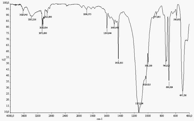 В ИК - спектрах (рис.) полученных соединений присутствуют полосы поглощения характерные для связи Si - Ph1131см-1 и 1429см-1 ; 1600см-1 скелетные колебания связи С - С в фенильном радикале, триплет в области 3000см-1 - 3100см-1 отвечает колебаниям связи C – H в ароматических системах. В области проявления силоксановой связи 1000-1130 см-1 ик-спектры полученных соединений имеют сложную колебательную структуру, что указывает на неоднородность полученных полимеров по строению. Колебания связи Si – O (W) четко не проявляются и лежат, по-видимому, в той же области.