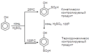 Сульфирование фенола осуществляется очень легко и приводит к образованию в зависимости от температуры преимущественно орто - или пара -фенолсульфокислот: