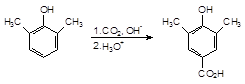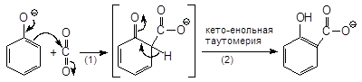 Диоксид углерода присоединяется к феноксиду натрия по реакции Кольбе, представляющей собой реакцию электрофильного замещения, в которой электрофилом является диоксид углерода
