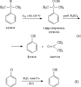 – Кумольный метод. Этим способом получают более 95% всего производимиого в мире фенола. В каскаде барботажных колонн кумол подвергают некаталитическому окислению воздухом с образованием гидропероксида кумола (ГПК). Полученный ГПК, при катализе серной кислотой, разлагают с образованием фенола и ацетона. Кроме того, ценным побочным продуктом этого процесса является α-метилстирол.
