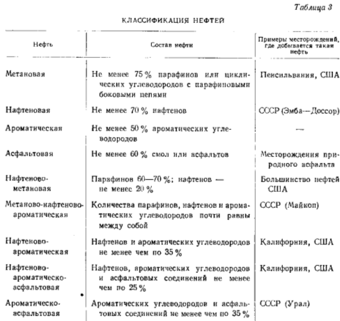 Указанная классификация не включает асфальтовые нефти, т. е. нефти, богатые асфальтами или битумами, которые по своему строению обычно родственны ароматическим углеводородам. Практически нефти представляют всегда смеси углеводородов, относящихся не менее чем к двум из этих четырех основных типов. В табл. 3 приведена классификация нефтей, предложенная Саханеном.