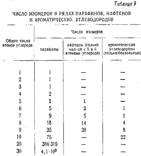 Все низшие парафины до пентанов включительно можно отделить друг от друга фракционированной разгонкой. В случае углеводородов с шестью или более атомами углерода число изомеров быстро увеличивается с увеличением молекулярного веса; ввиду этого, а также в связи с присутствием среди углеводородов с шестью и более атомами углерода, помимо парафинов, также нафтеновых и ароматических углеводородов простая перегонка становится неэффективной. Следует особо подчеркнуть, что выделение высших членов гомологических рядов углеводородов простыми физическими средствами почти невозможно из-за большого числа изомеров. Таким образом, углеводороды сложного строения приходится синтезировать из более простых; это одна из причин, определяющих важное значение низших парафинов и олефинов для промышленности химической переработки нефти. Число возможных изомеров в трех рассматриваемых рядах углеводородов (не считая геометрических изомеров) указано в табл. 9.