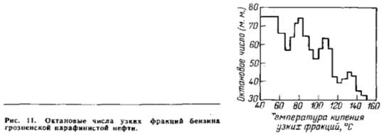 Октановые числа узких бензиновых фракций грозненской пара- финистой нефти приведены на рис. 11. Указанные свойства бензинов нефтей парафинового основания привели еще в 30-х гг. к предложению рационального выбора температуры отбора бензина, исходя из того, чтобы она не совпадала с температурой выкипания соответствующего нормального парафинового углеводорода, т. е. отбирать головную бензиновую фракцию до 90 - 95°С, но не до 100°С во избежание попадания в нее н-гептана, или, если позволяет октановое число, до 120 °С, чтобы компенсировать снижение октанового числа увеличением выхода. Более радикальным методом исправления октанового числа явилось предложение удалять из низкооктановых бензинов детонирующие центры посредством четкой ректификации. Так,, по данным [1], при перегонке с ректификацией бензина с октановым числом 58,5 (м.м.) грозненской парафинистой нефти можно получить, извлекая низкооктановые узкие фракции, 37% бензина с октановым числом 77,4 (м. м.). О возможности подобного облагораживания прямогонных бензиновых фракций упоминается и в более поздних работах.