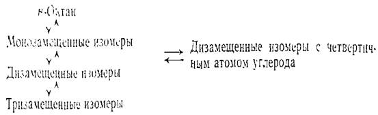 Алканы нормального строения: начиная с пентана углеводороды этого ряда характеризуются очень низким октановым числом, причём чем выше их молекулярная масса, тем октановые числа ниже. Существует почти линейная зависимость от их молекулярной массы. Алканы разветвлённого строения: разветвление молекул предельного ряда резко повышает их детонационную стойкость, так у октана октановое число 20, а у 2,2,4 - триметилпентана 100. Наибольшие октановые числа отмечаются для изомеров с парными метильными группами у одного углеводородного атома (неогексан, триптан, эталонный изооктан), а также у других триметильных изомеров октана. Благодаря высоким антидетонационным свойствам изоалканов – они весьма желательные компоненты бензина.