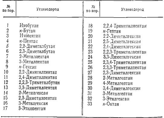Больше всего внимания исследователи уделяли выяснению состава бензинов как вследствие сравнительной простоты такой задачи, так и вследствие связи между составом бензина и его октановым числом. В литературе можно найти описания подробных исследований американских, советских и других бензинов прямой гонки. В табл. 5 приведен перечень углеводородов, обнаруженных в американском депентанизированном бензине прямой гонки, полученном из нефти месторождения в Понка-Сити (температуры кипения низших углеводородов помещены в приложении, стр. 411 разгонкой, также осуществляемой под давлением. Эти газы называют обычно «жидкими газами».