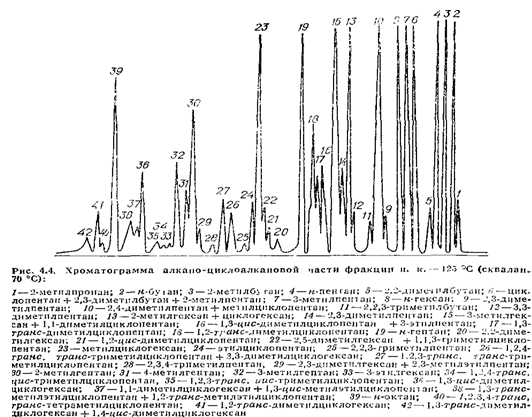 Выполнение анализа. В состав этой фракции входят углеводороды до C8 включительно. Хроматографичсский анализ этой фракции проводится при нескольких температурах: 30, 50 и 70 "С. Проводя анализ при разных температурах, используют известный эффект изменения относительного времени удерживания ряда углеводородов при изменении температуры колонки. Различия в изменении времени удерживания для изомерных углеводородов используют для подтверждения их нахождения в данном хроматографическом пике. Так, при анализе бензиновой фракции н. к.— 125 °С (температура колонки 30 °С) метил- циклогексан, 1,1,3-триметилциклопентан и 2,2-диметилгексан выходят одним хроматографическнм пиком, а при 70 °С эти углеводороды разделяются; 1,2-транс-диметилциклогексан, н-октан и 1,2,3,4-транс, транс,транс-тетраметилциклопентан при 50°С выходят совместно, а при 70 °С — разделяются. Кроме того, с увеличением температуры анализа время выхода циклоалканов увеличивается относительно эталонного ряда алканов,- Основной рабочей температурой анализа является температура 70°С. При этой температуре снимается основная хроматограмма (рис. 4.4). Поскольку изменения температуры влияют па порядок выхода углеводородов, необходимо поддерживать постоянной температур} анализа.