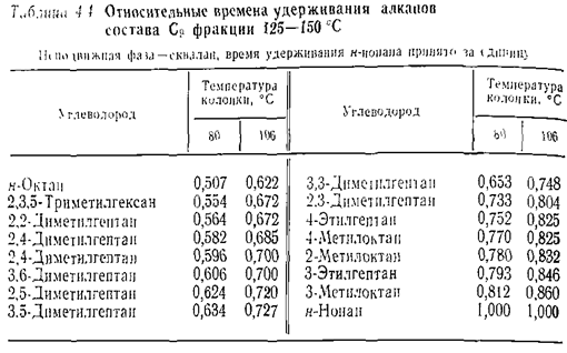 Приняв время удерживания к-гексана за единицу, рассчитывают значения времени удерживания для всех пиков па хроматограмме п, сравнивая их с данными табл. 4.3, проводят идентификацию пиков.