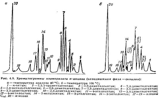 Отогнанную на ректификационной колонке фракцию анализируют при температурах 80 и 1060 С на той же колонке с неподвижной жидкой фазой — сквалан, на которой анализировалась первая фракция. При указанных температурах снимают хроматограммы фракции бензина 125—150 °С и изомеризата н-нонана.